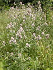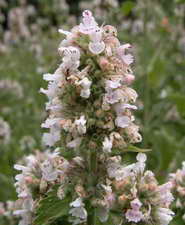 Ajuga reptans L., ajuga, bugle rampante Ajuga is a perennial herb, spreading mostly by its vigorous rhizomes. It has stems up to 6 inches (15 cm.) high. Racemes have 6 to 12 blue or purple flowers. This introduced plant has been used as a ground cover, as an ornamental, and as a medicinal plant. It can escape from cultivation and become a troublesome weed locally. Dracocephalum parviflorum Nutt., American dragonhead, dracocéphale d’Amérique Annual to biennial, spreading by seeds; plants 1 to 3 feet (3 to 9 dm.) high; flowers irregular, blue to purple; most common in the mid-west; clover fields, gardens, native grassland, clearings, edges of woods, roadsides, and waste places; native to North America. Galeopsis tetrahit L., hemp-nettle, ortie royale Annual, spreading by seeds, 1 to 3 feet (3 to 9 dm.) high; flowers irregular, white to purple; throughout; gardens, pastures, barnyards, and waste places; introduced from Europe and Asia. Glechoma hederacea L., ground-ivy, lierre terrestre Perennial, spreading mainly by creeping stems that root at the nodes; flowering stems 3 to 10 inches ( 8 to 25 cm.) high; irregular flowers, purple-blue; throughout, but most common in the east; lawns, gardens, and waste places; introduced from Europe and Asia. Sometimes grown as a garden plant, but soon becomes a serious pest. Leonurus cardiaca L., motherwort, agripaume cardiaque Rhizomatous perennial 2 to 4 ft. (60 to 120 cm) tall with axillary clusters of small pink to lilac flowers in the upper axils of leaves. Introduced from Europe and Asia for its use as a herbal remedy. It has become sporadically naturalized in pastures, waste ground, disturbed sites, roadsides, and along railway lines throughout our area. Nepeta cataria L., catnip, herbe à chat Perennial, spreading by seeds; flowers creamy white or pinkish with pink spots; stems 1.5 to 6 feet (5 to 60 dm) heigh; throughout, but more common in the east, sometimes cultivated; gardens, pastures, hedgerows, fencerows, old fields, roadsides and disturbed areas; crushed foliage is strongly scented. Introduced from Eurasia. Prunella vulgaris L., heal-all, brunelle commune Perennial, semi-creeping herb, rooting at the nodes; flowers blue; throughout our area. Some populations are native whereas others are introduced. Often an aggressive weed in lawns. Also occurs in other grasslands, in waste ground, in open woods, and along roadsides. Stachys palustris L., marsh hedge-nettle, épiaire des marais A hexaploid perennial with subterranean stolons terminating in crisp, fusiform, whitish or whitish-yellow tubers. Stems 1 to 3 feet (3 to 9 dm.) high; flowers irregular. Introduced from Europe. Known to occur as early as August 1815 near Amherst, Maine. It is now locally common in moist habitats in southeastern Canada and in the northeastern United States. Marsh hedge-nettle tubers often penetrate potatoes growing in fields. This makes these potatoes virtually unsaleable. Text and photos of catnip by Stephen J. Darbyshire Click on a photo to view an enlarged image.